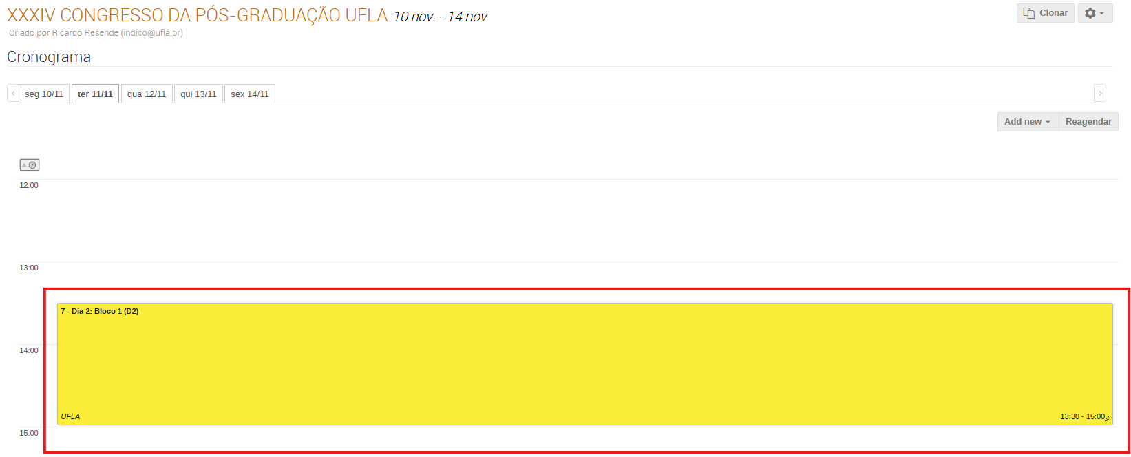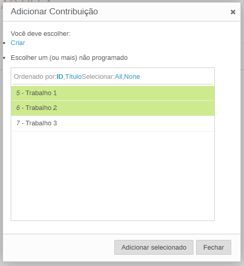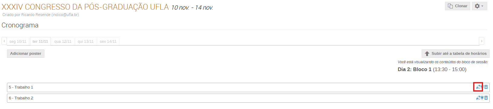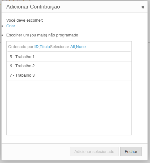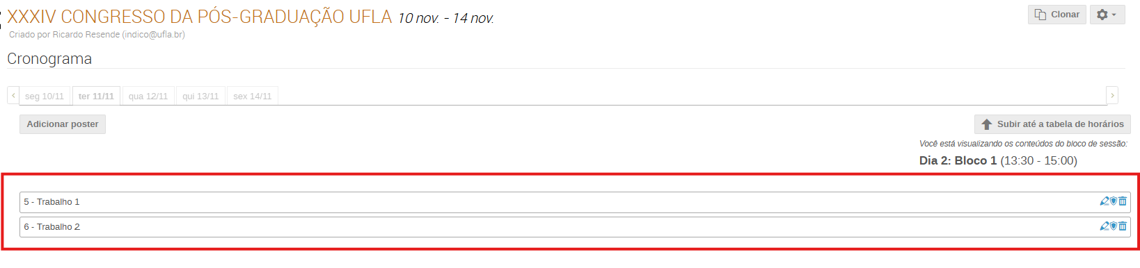 Em caso de evento que tenha apresentação de trabalhos, é necessário que haja trabalhos já aceitos no sistema, para que o cronograma possa ser criado.