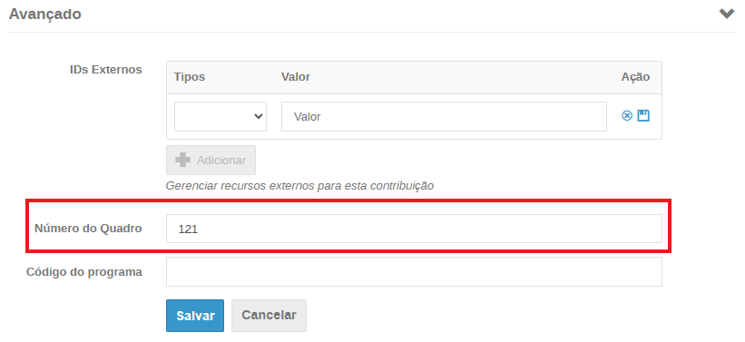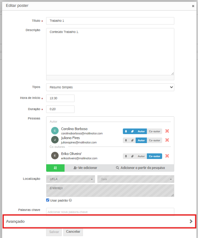 31. Para inserir o número do quadro onde o pôster será exposto no local de apresentação, clique em “Avançado”: