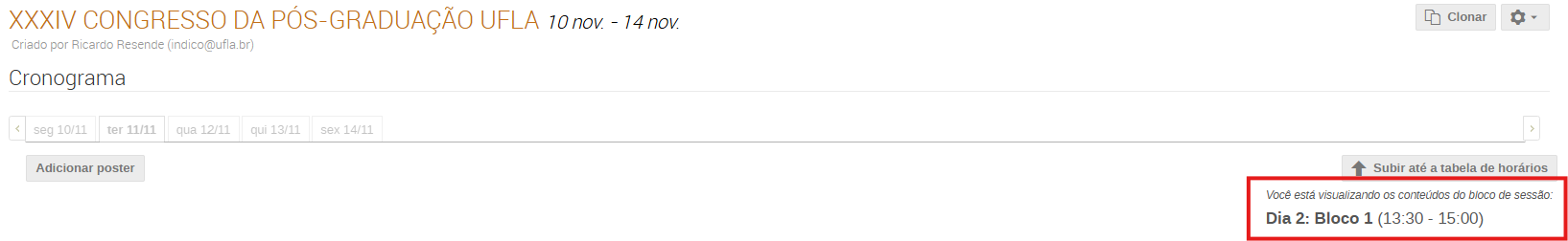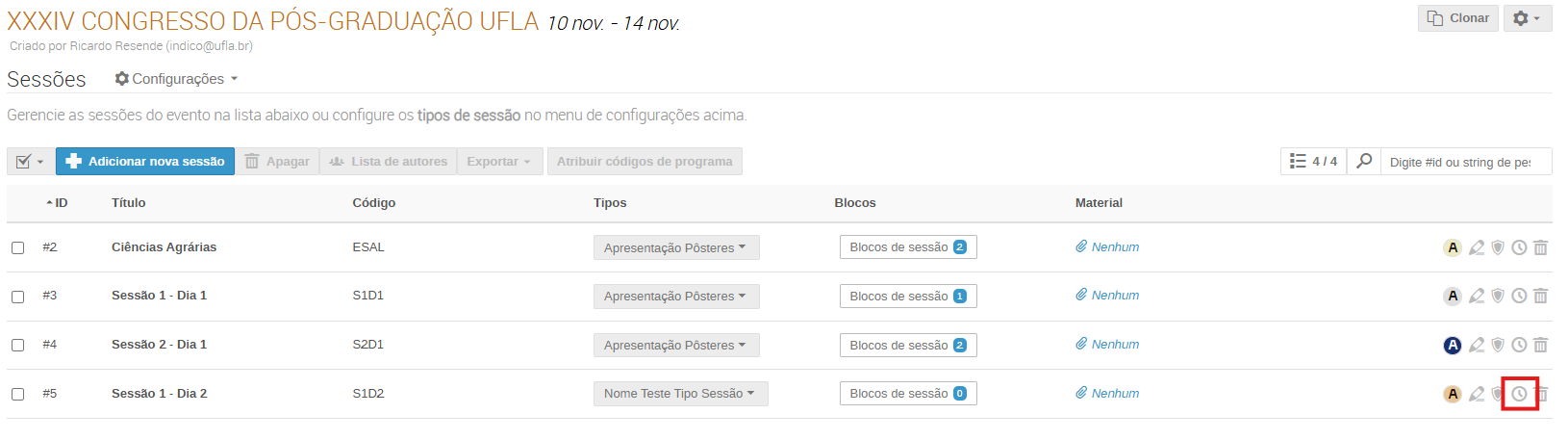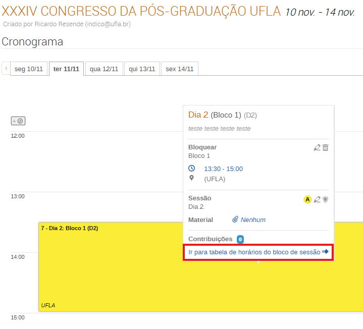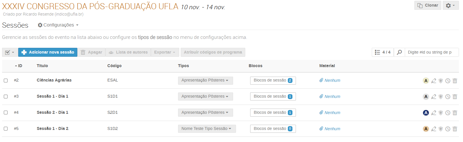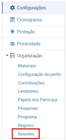 Você poderá criar um cronograma para o evento, organizando sessões e blocos de sessões.