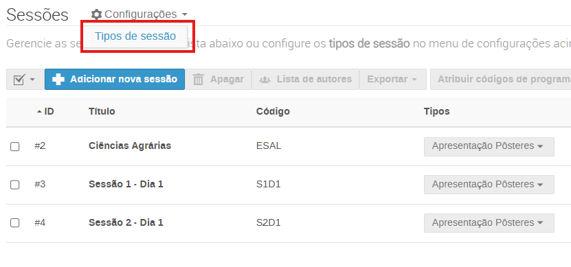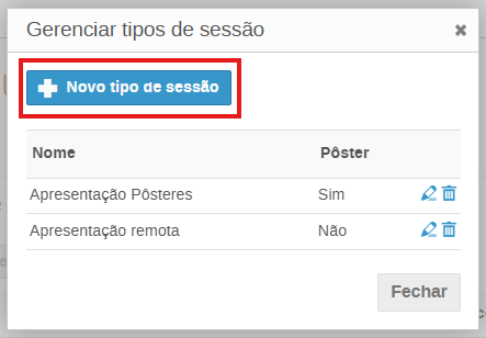 4. Para adicionar um tipo, clique em “Novo tipo de sessão”: