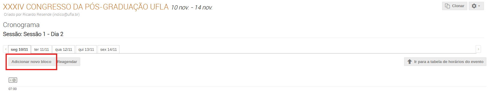 21. Na tela “Cronograma”, observe se está na sessão deseja e clique em “Adicionar novo bloco”: