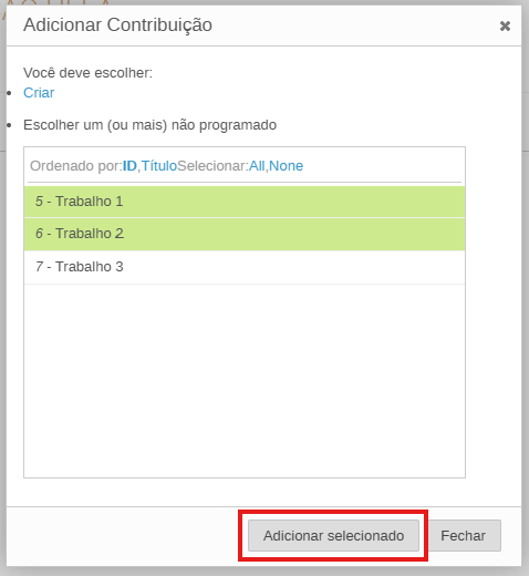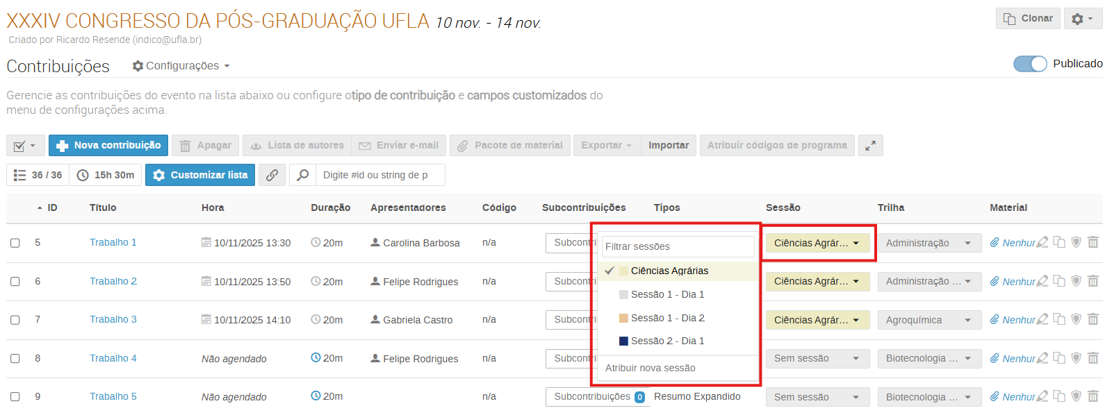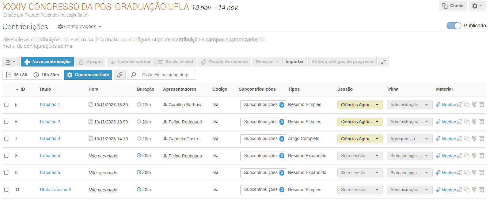 18. Na tela “Contribuições”, todas os trabalhos serão listados: