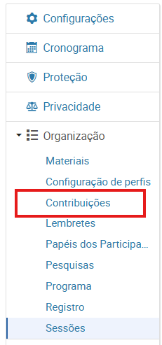 17. Para vincular um trabalho a uma sessão existente, clique em “Contribuições” no menu principal: