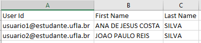 4 - Então, selecione a opção Adicionar, defina o tipo de usuário (professor, Aluno, Outro) e adicione o arquivo (formato do arquivo abaixo), logo após clique em Executar