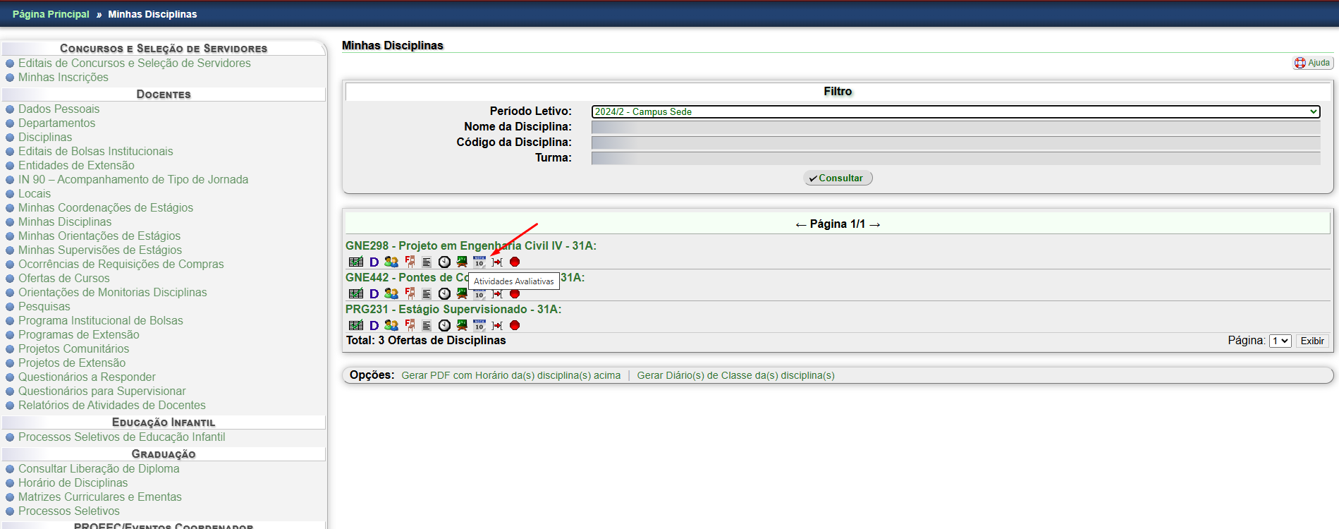 • Clique em Minhas Disciplinas para acessar as disciplinas em que você é docente.