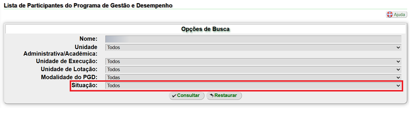 Ao acessar Programa de Gestão e Desempenho >> Participantes você terá acesso a uma tela que lista todos os participantes do PGD na UFLA. Nessa tela foi adicionado o filtro Situação, com as opções: Com Plano de Trabalho Ativo, Sem Plano de Trabalho Ativo, Sem Plano de Trabalho Aprovado. Abaixo estão as regras utilizadas para cada uma das opções mencionadas: