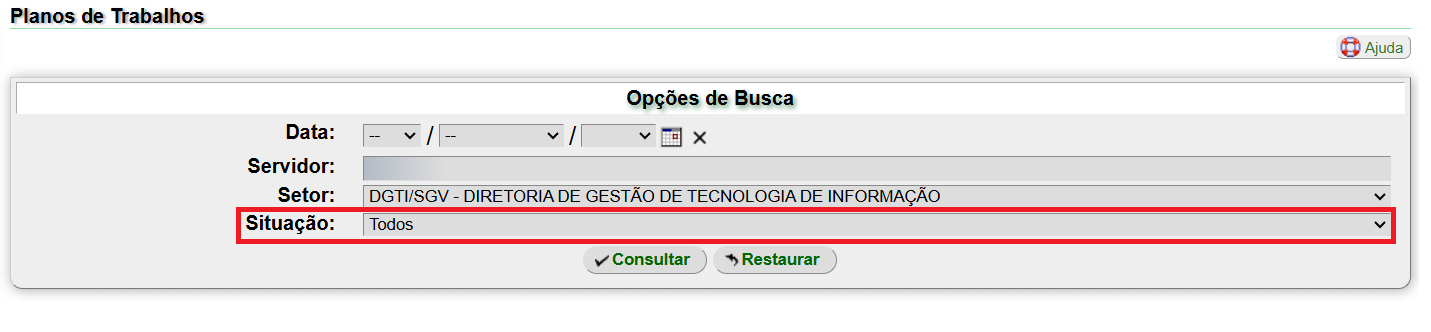 Sem Plano de Trabalho Ativo: exibe a lista dos participantes que não criaram e enviaram o Plano de Trabalho para aprovação da chefia