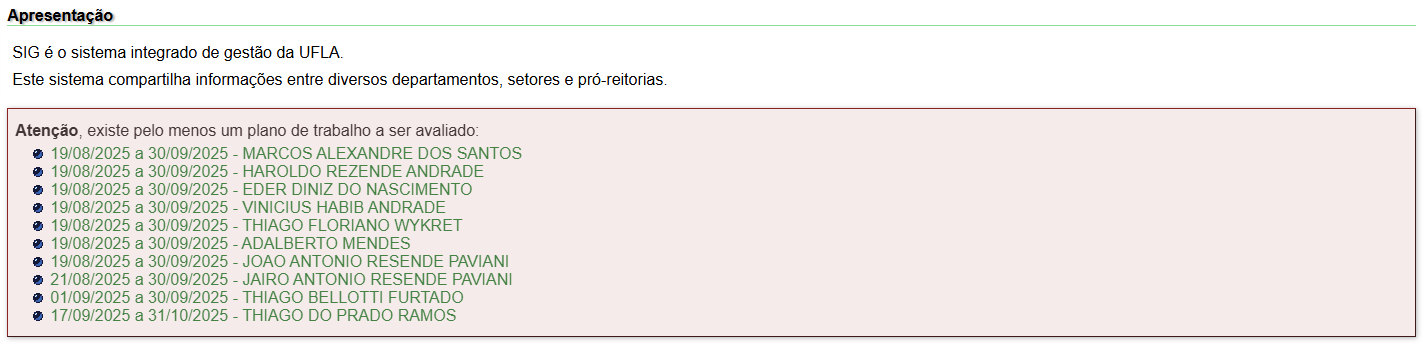 Ao acessar o SIG-UFLA, servidores e chefias poderão visualizar informações pendentes que exigem alguma ação no sistema para regularização. Cada informação contém um link que direciona diretamente para a página onde a ação deve ser realizada.
