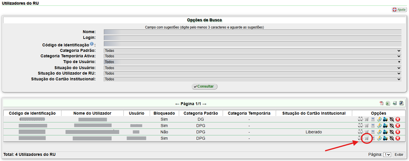 4.1. Na tela "Utilizadores do RU", todos os utilizadores serão listados: