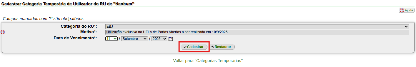 9. Na tela "Cadastrar Categoria Temporária de Utilizador do RU", selecione a "Categoria do RU", informe o "Motivo" para a atribuição da nova categoria temporária e a "Data de Vencimento".