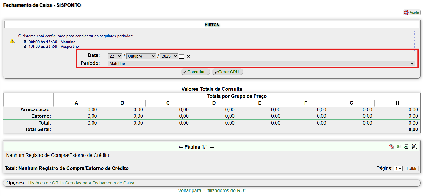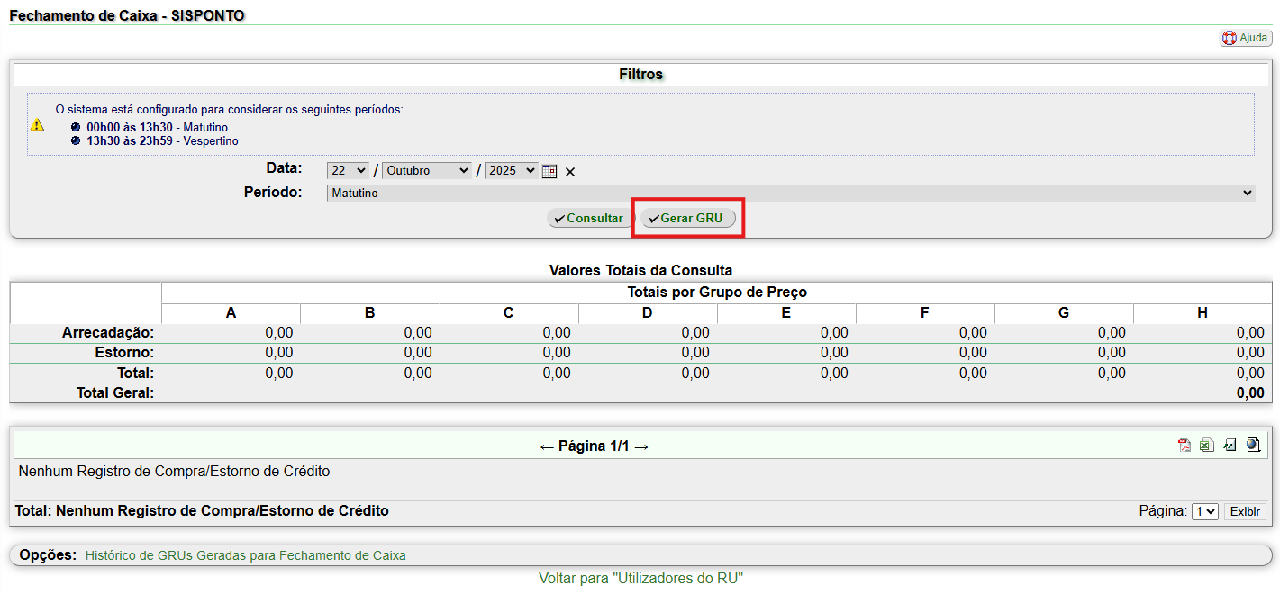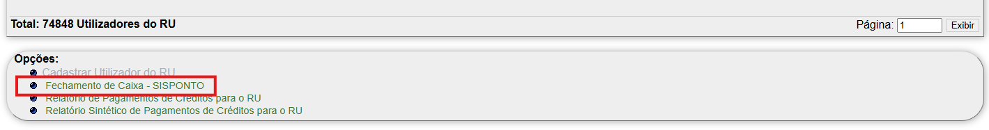 3. Na tela "Utilizadores do RU", clique em "Fechamento de Caixa - SISPONTO":