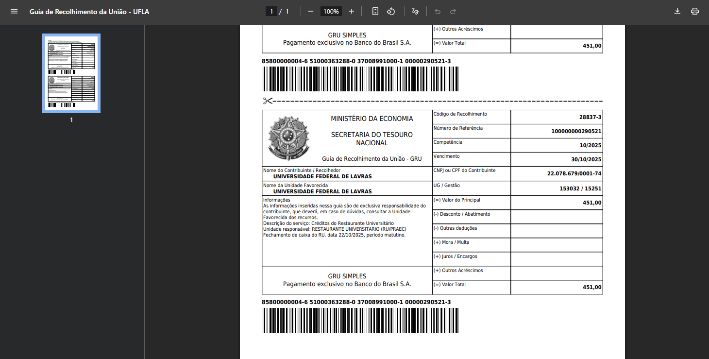 O fechamento de caixa diário da arrecadação do Guichê do Restaurante Universitário é realizado pelo SIG-UFLA.