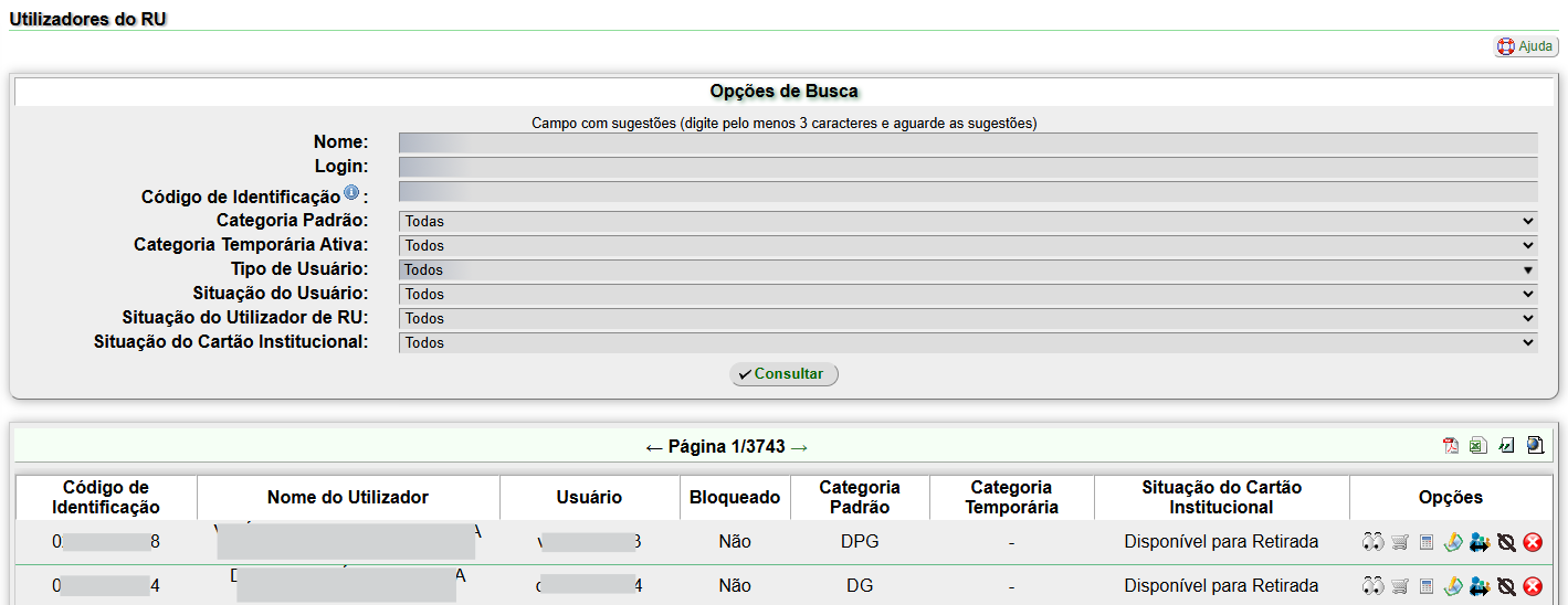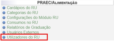 2. No Grupo "PRAEC/Alimentação" do menu principal, clique em "Utilizadores do RU":