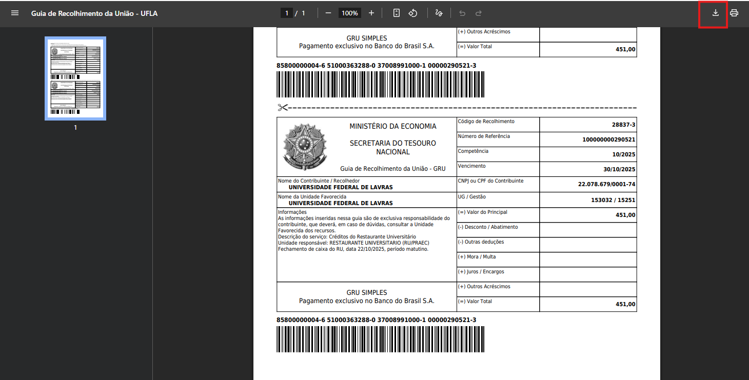 9. Será exibida a tela para salvar / imprimir a GRU: