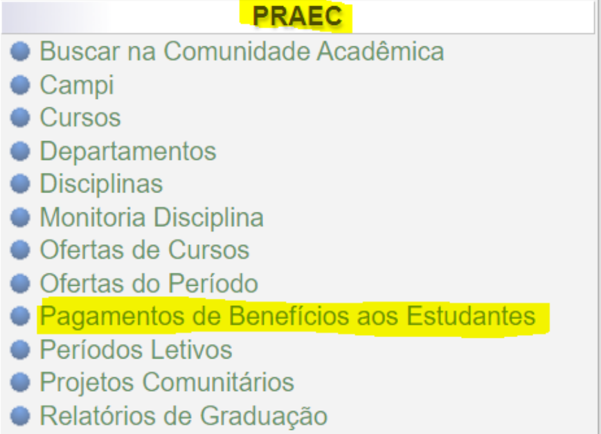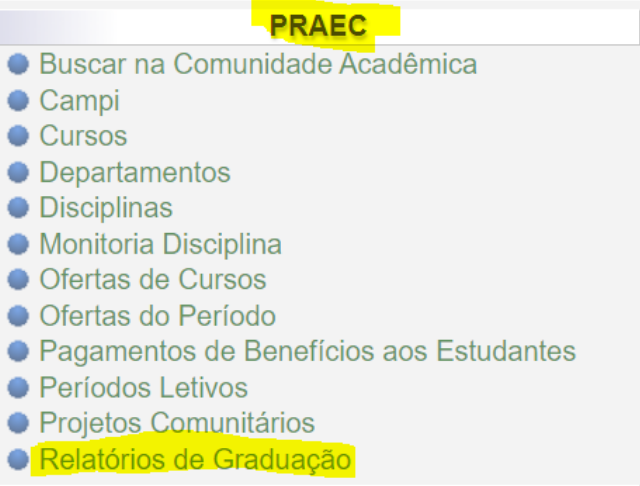 O relatório de pagamento dos estudantes deve ser gerado no caso de uso “Relatórios de Graduação” que está disponível no grupo PRAEC, conforme imagem abaixo: