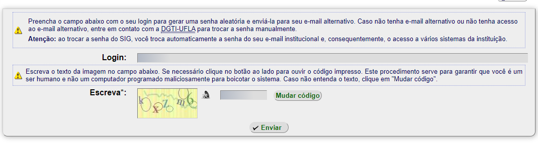 Para recuperação da senha utilize a opção esqueci minha senha na tela principal do SIG_UFLA (https://sig.ufla.br/modulos/login/nova_senha.php):
